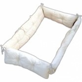 ベビーベッド用のサイドガードです。(内寸70×120cmに対応)赤ちゃんがベッドの柵に頭や体をぶつけたり、冷暖房の風が直接あたるのを防いでくれます。4つのパーツに分けられるので、ガードしたい部分に取り付けられます。シンプルな生成りベースでどんなお布団にも合わせやすいデザインです。カラフルなひも使いがデザインのポイント。<本体サイズ> ヘッドクッション:約70×28cm ×1枚 サイドクッション:約120×28cm ×2枚 フットクッション:約70×28cm ×1枚(内寸70×120cmのベビーベッドに対応)<主な材質> 側地:コットン100% 中わた:ポリエステル100%製造国:日本 パッケージサイズ:幅 72 x 高さ 25 x 奥行き 44 cm 商品番号:587855100