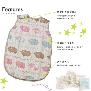 洗うたびふわふわになる6重織ガーゼのスリーパーです。股部分にボタンがついているので、はだけにくく安心です。綿100%の6重ガーゼは抜群の吸水力で赤ちゃんの汗やお風呂あがりの水分をやさしくケア。やさしい肌ざわりと肉厚でふんわりした風合いに仕上がっています。べたつかず、通気性が良く、吸水力の高い多重織ガーゼがデリケートな赤ちゃんをやさしく包み込みます。こちらの商品は「進級進学お祝い!すくすく成長キャンペーン」エントリー対象商品です。抽選で40名様に豪華プレゼント!2016年3月31日(木)17時まで【エントリー】はコチラ≫≫
