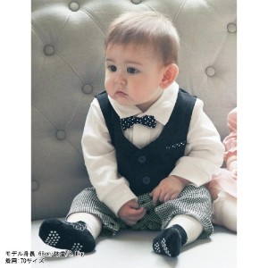 特別なシーンを華やかに演出する、とっておきのおめかし服。着心地にもこだわったフォーマルウエアです。白シャツ&黒ベスト、千鳥格子のパンツに、ポイントはドット柄の蝶ネクタイとチーフ。きりっとおしゃれなスタイルが一枚で決まります。お着替え簡単でうれしい前開きカバーオールです。