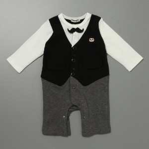 フォーマルやセレモニーにぴったりの、正装風に仕上げたカバーオール。襟元にあしらったヒゲモチーフや、アニマル柄の刺繍が遊び心を感じさせます。フロントがスナップボタンで全開するので、お着替えスムーズ。ソフトな風合いの綿100%素材を使用しています。