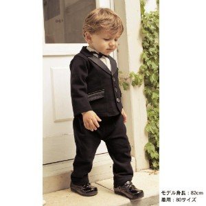 ジャケットの衿やフラップはサテン生地、後ろにスリットも入った本格仕様。後ろゴムではかせやすいパンツの前部分はカマーベルト風。見た目はきっちり、でも着心地はベビーのことを考えたラクなカットソー素材です。