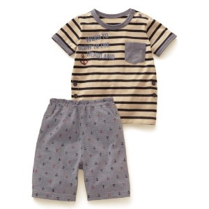 寝苦しい夜も快適にマリンテイストがさわやか。ネイビー系ボーダーとかすれ調プリントもおしゃれです。ハーフパンツはお腹が出にくいサイドボタン仕様です。