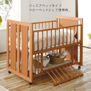 明るい木目の天然木を使用した国産ベビーベッド。床板の高さはお好みに合わせて調節でき、ベッド下はおむつなどを入れておく収納スペースとして使用できます。キャスター付きなので移動もラクラク。そしてベビーが成長したら、それぞれチャイルドベッド(縦約155cm・小学校低学年用)とジュニアベッド(縦約185cm・・・