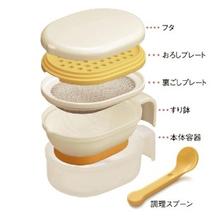 おろす、裏ごし、すり鉢など、離乳食づくりに欠かせないプレートや容器のセット。必須アイテムをコンパクトにまとめたのでキッチンもスッキリ。帰省時や旅行の時も便利。