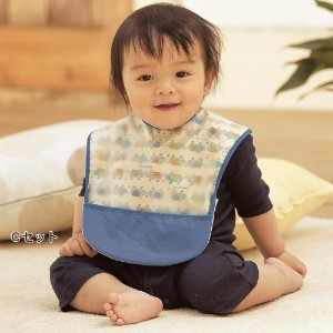 食べこぼしなどの水分は、表側のパイル地がしっかり吸収。裏側には防水布を使用しているためベビー側への浸透はナシ。快適にお食事が楽しめます。食べかすをキャッチする裾ポケットで、散らかりのお悩みも軽減。