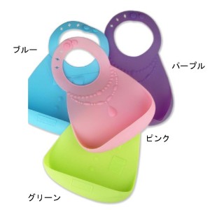 シリコン製なので洗って拭き取ればまたすぐ使えて便利なシリコンビブ。硬すぎず柔らかすぎない素材なので、食べこぼしをしっかりキャッチ。また着脱も容易で、着用の負担も少ないのが魅力です。カラフルな4色展開でご案内します。