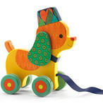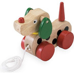 木のおもちゃ プルトイ 誕生日プレゼント 出産祝い クリスマス プレゼント カラフルでオシャレな柄をしたフランス・DJECOのイヌをモチーフにした木製のプルトイです。 タイヤの車軸が左右共に中心からずらしてあるので、引くとヨチヨチと体を左右に揺らしながら歩きます。 歩き始めの頃は、ヒモを持って歩く・・・