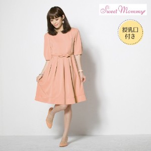 マタニティフォーマル 通勤に 授乳対応マタニティリボンベルト付五分袖ワンピース スウィートマミー 授乳対応産後異素材使いワンピース