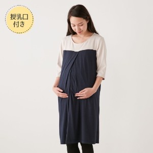 授乳対応マタニティバイカラータックワンピース 授乳対応産後Vネックワンピース
