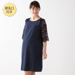 袖を繊細なレースで切替えた、キレイめ素材の大人フェミニンなワンピース。両肩にあしらったリボンモチーフで、女性らしいアクセントを効かせています。身頃サイドの切替えに沿ってファスナータイプの授乳口が付いており、産後まで長く着られるのも◎。品よくキマるので、色んなシーンに活躍します。 色: