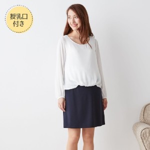 ほんのり透け感のあるシフォンと、ソフトなポンチ素材を切替えたキレイめデザイン。フロント中央部分のみ縫いつけたドレープのあるシルエットが、エレガントなスタイリングを印象づけてくれます。スカート部分をややタイトにスッキリ仕上げることでトップスともバランスよくキレイに見せてくれます。トップスのサイドをめくると、内側にスナップボタン留めの授乳口が付いています。※ご購入可能な色・サイズ・タイプは、”在庫・価格を一覧でチェックする”でご確認ください。 色: