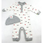 アメリカの有名ブランド、カーターズ(Carterfs)のカバーオール&帽子 セット 可愛いデザインとカラフルな色使いで、日本のママ達の間でも人気のブランドです。 白地に汽車のプリント模様のカバーオール&帽子 セット 胸元と股下にスナップボタン付き 薄手で肌ざわりの良い生地です 帽子・・・